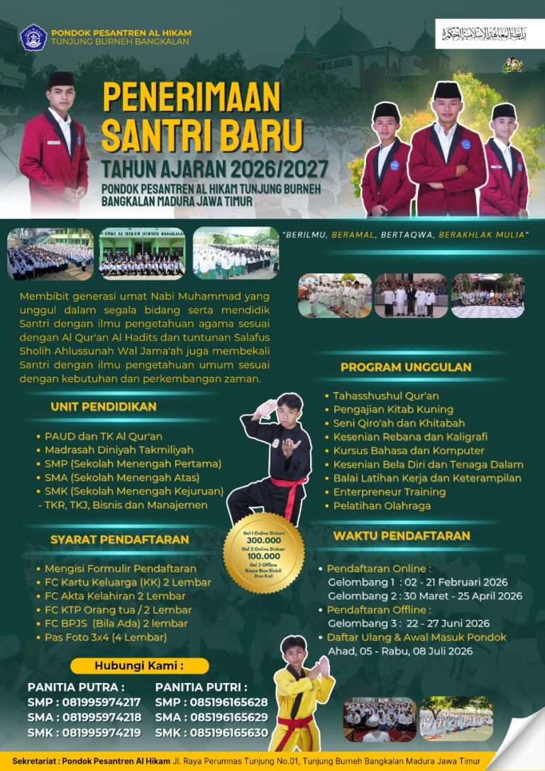 Pondok Pesantren Al Hikam Bangkalan membuka Registrasi Penerimaan Santri Baru (PSB) untuk Tahun Ajaran 2026/2027. Pendaftaran calon santri dapat dilakukan melalui dua jalur, yaitu online dan offline, dengan ketentuan sebagai berikut: